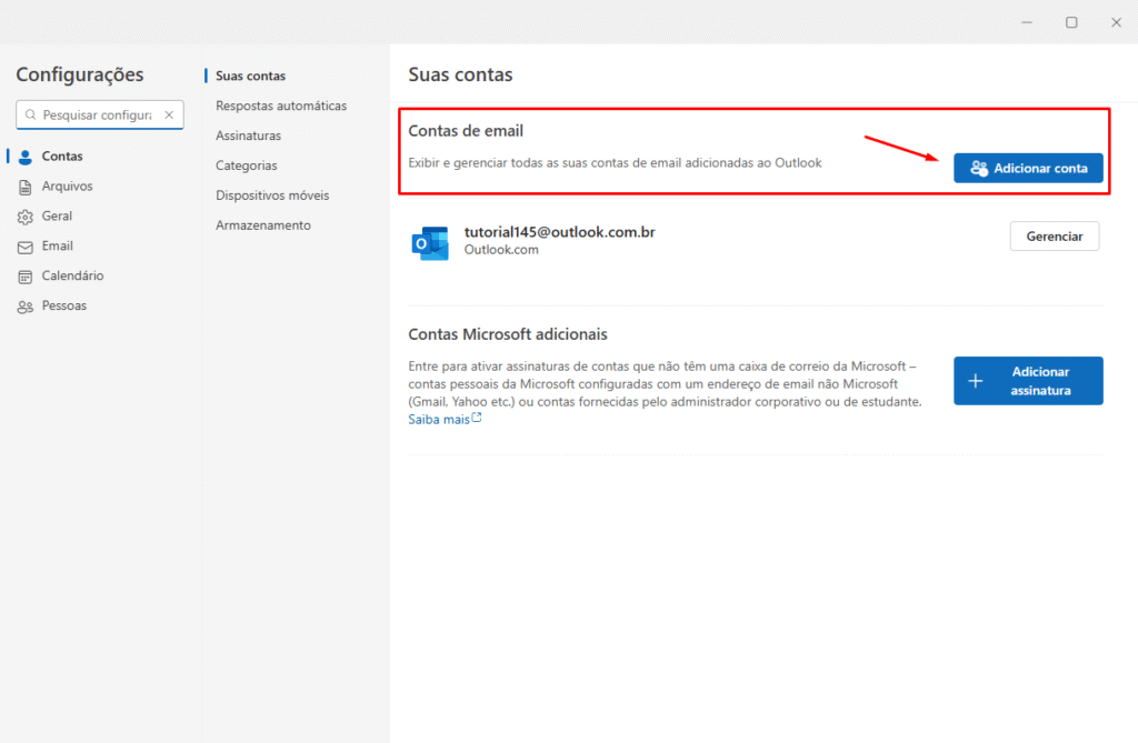 Em Contas -> Suas Contas, terá a opção Adicionar Conta, clique nela para começar o processo.