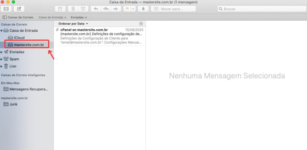 Se você seguiu os passos corretamente, sua tela no Mail do MacBook deve aparecer assim: com a Caixa de Entrada do seu e-mail profissional já listada na barra lateral e as pastas sincronizadas (Enviadas, Spam, Lixo, etc.).