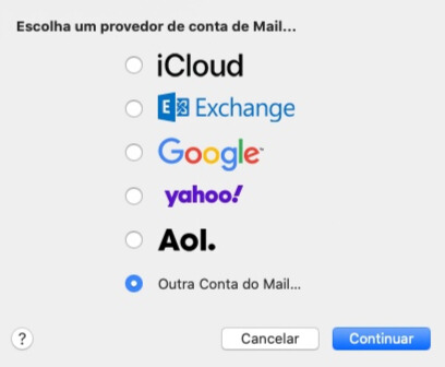 Na tela que abrir, selecione Outra Conta de Mail e clique em Continuar.