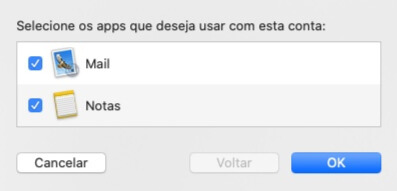 Na tela final, marque os apps que deseja usar com a conta (deixe Mail selecionado e Notas se quiser sincronizar também).